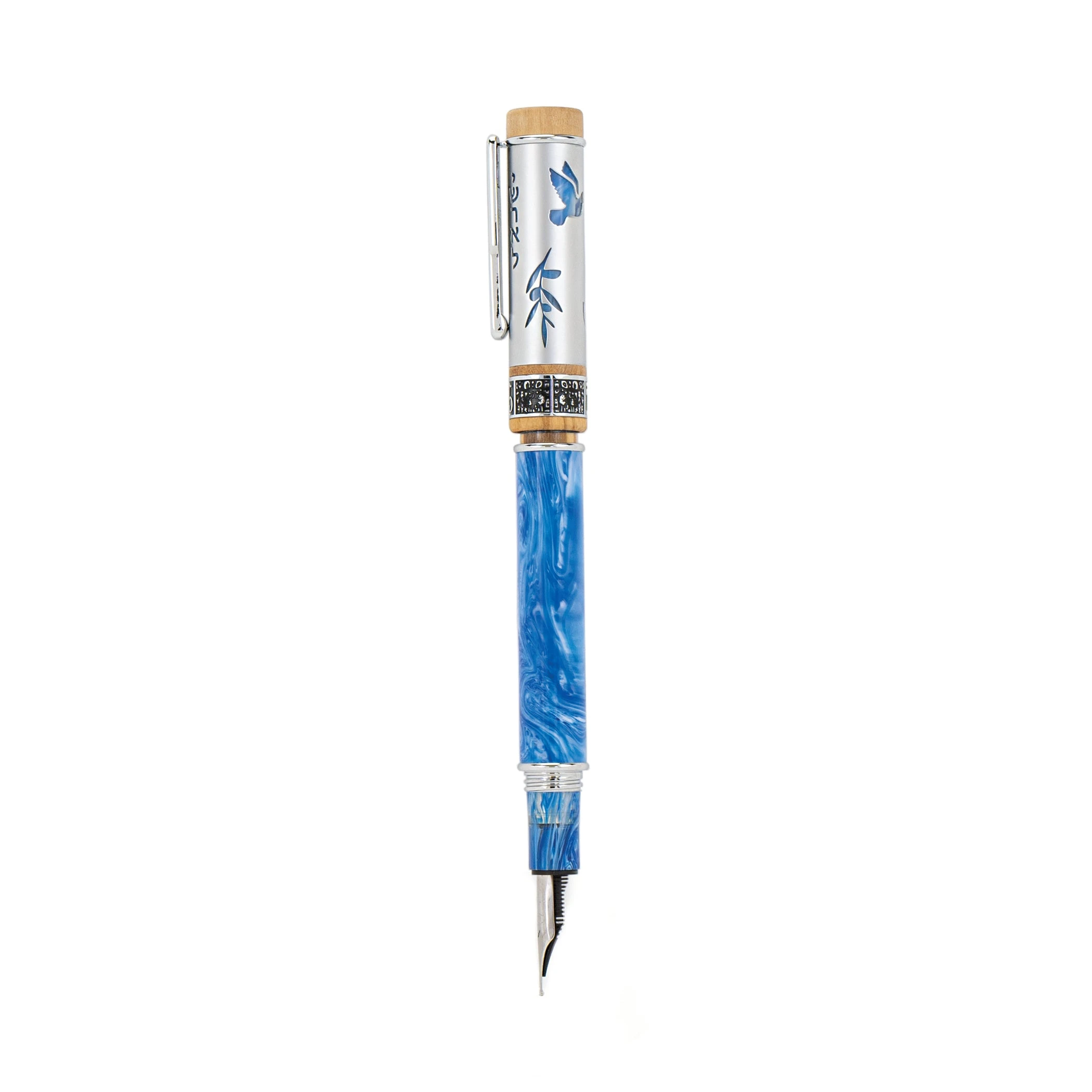 Machined to perfection and scrupulously hand-polished, the Israel 75 body features one of a kind high-graded blue and white resin, olive wood, and is then adorned with striking chrome accents along the overlay, clip and rings.