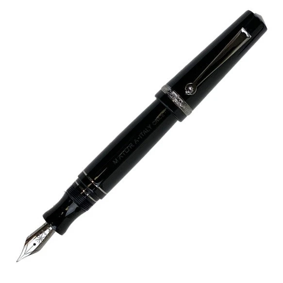 Turned from a solid block of resin, this Mariora collection features a highly polished black resin and Ruthenium plated accents. The center ring and clip is symbolic of no detail left undone by Maiora.