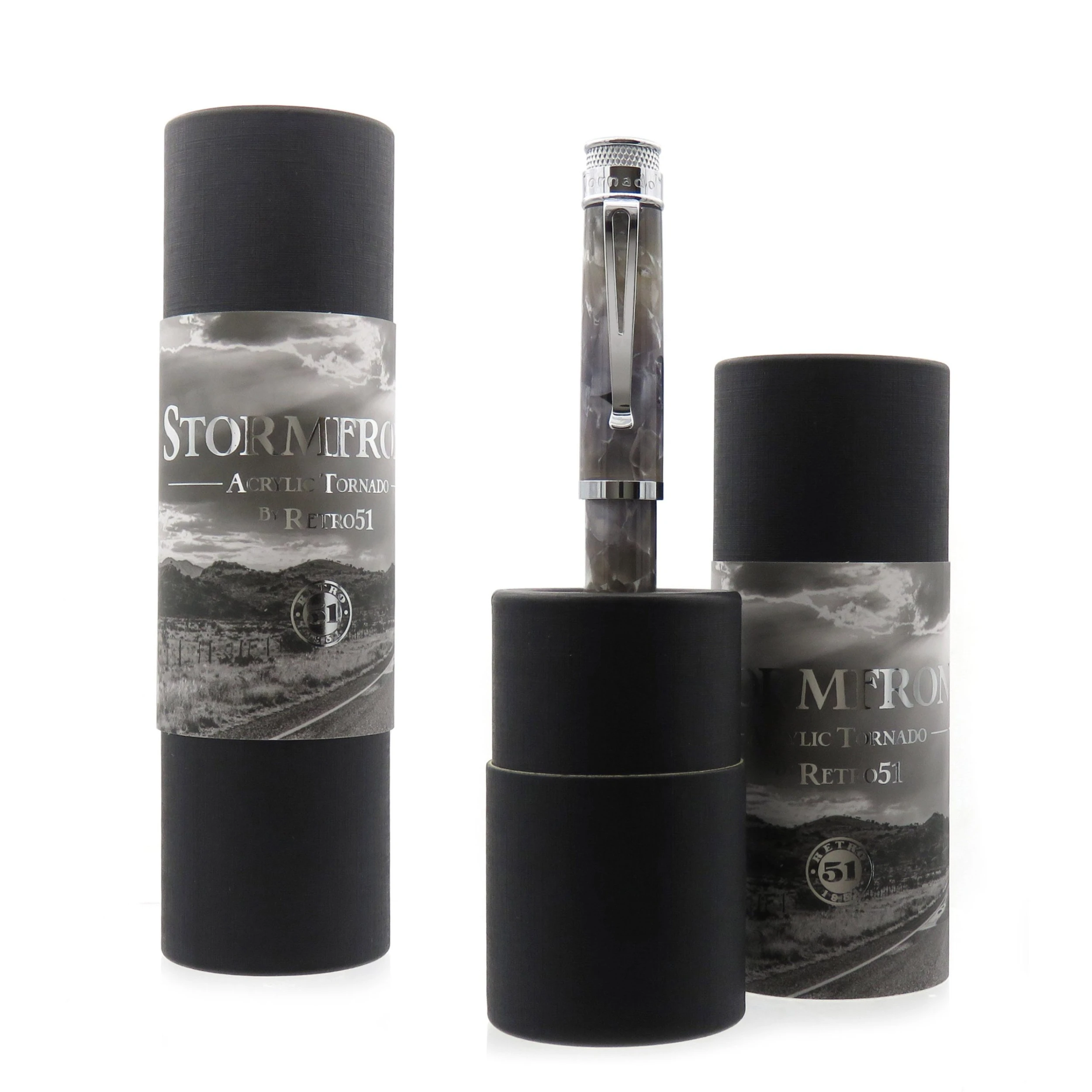 The acrylic barrels with supercell pattern are polished to a gloss finish and complete with chrome accents. Each one is loaded in packaging featuring B&W photography by Retro51 collector Mike Gfeller with silver foil embellishments.