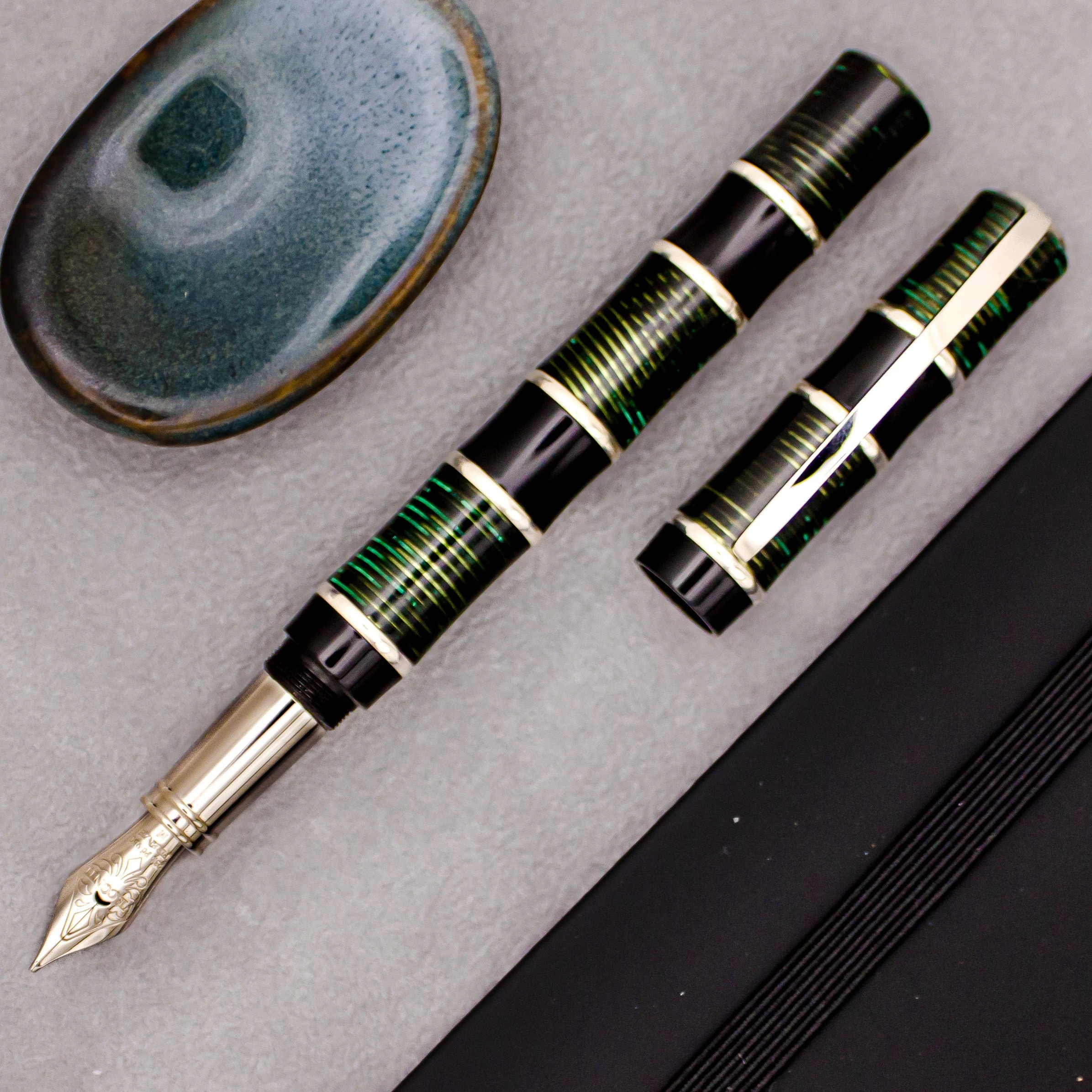 Visconti is pleased to introduce the Asia Bamboo, a unique collection of fountain pens inspired by one of natures most wondrous gifts to mankind and the charm of Asia’s magnificent landscapes that it is home to. Bamboo cane is a plant of notable economic and cultural significance. Primarily found in South East Asia bamboo is known for its uses in construction, as a sustainable food source and its ability to reduce soil pollution. Visconti celebrates the bamboo plant with a unique collection of pens made from one of fine writings most iconic materials, ‘stacked’ celluloid.
